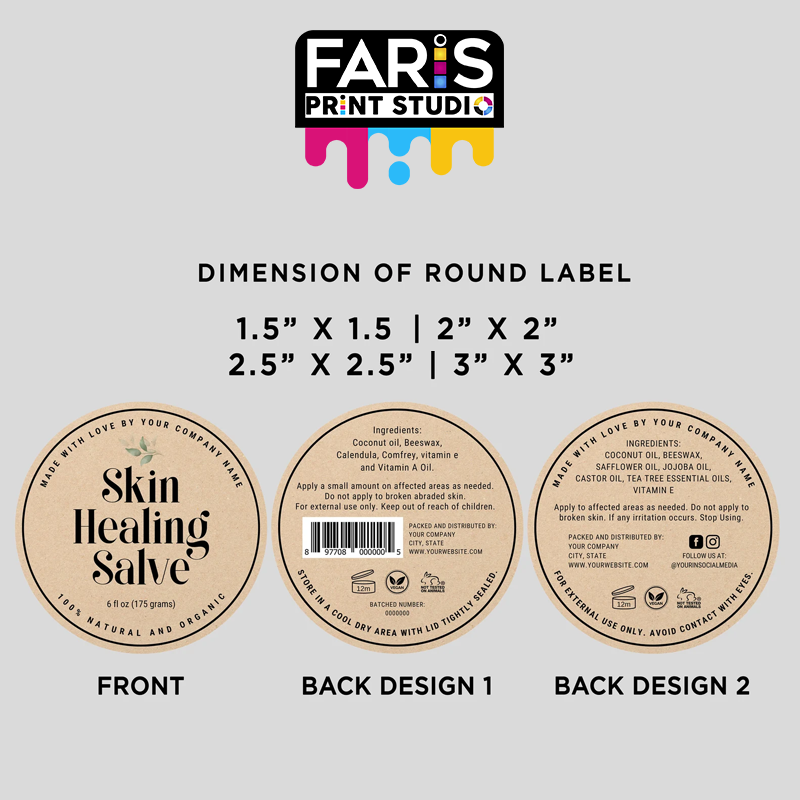 Premium round label stickers for skin healing salves, balms, and natural skincare products. High-quality printing with custom design options, perfect for small businesses and cosmetic packaging.